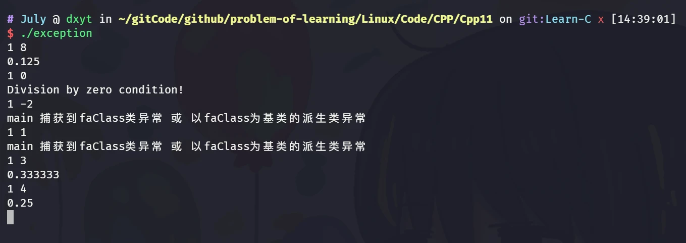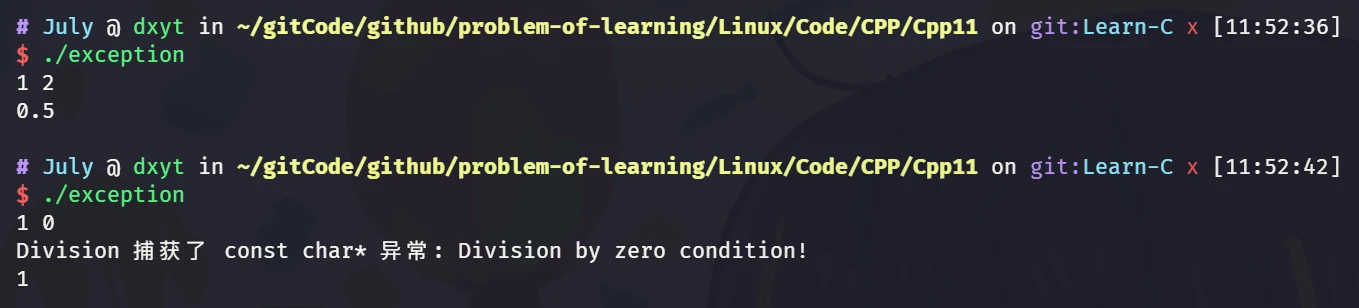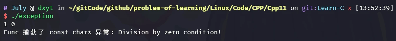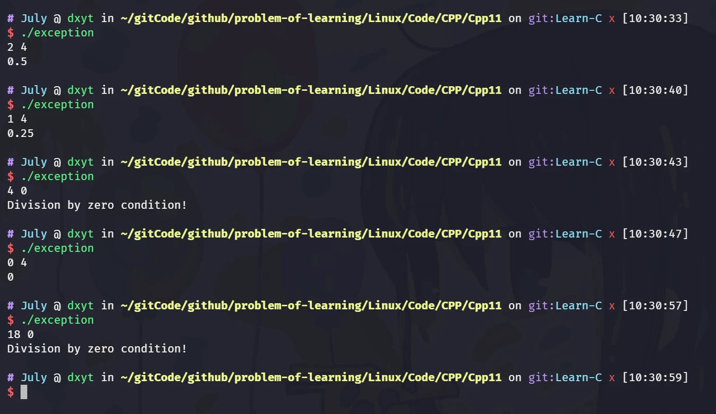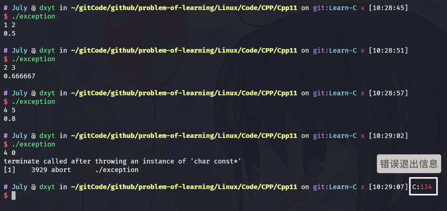 执行代码后, 可以发现 当遇到除零错误时, 会打印字符串"Division by zero condition!", 且 没有返回错误退出信息