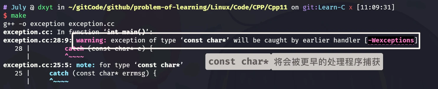 catch:try {}catch (const char* e){}catch (const char* e){}在一些编译器中会报错, 最少也是一个警告: