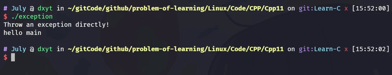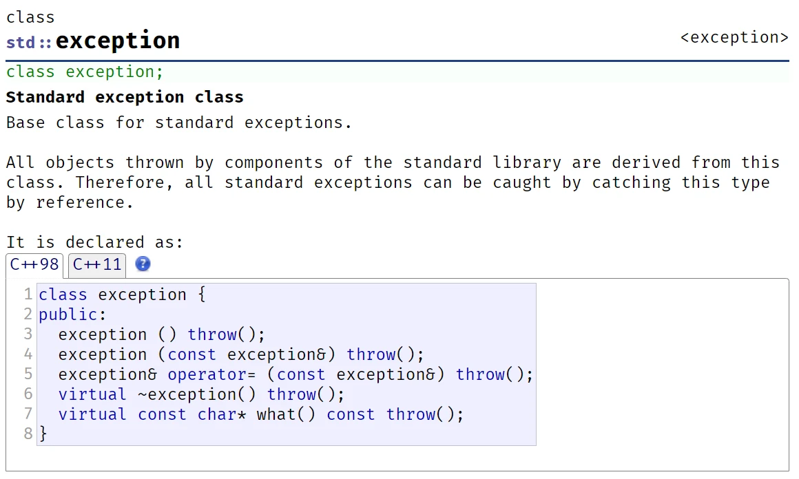 也就是说, 通过捕获std::exception捕获到异常对象之后, 可以调用其成员函数what()并接收其返回值, 进而判断捕获到的是什么异常
