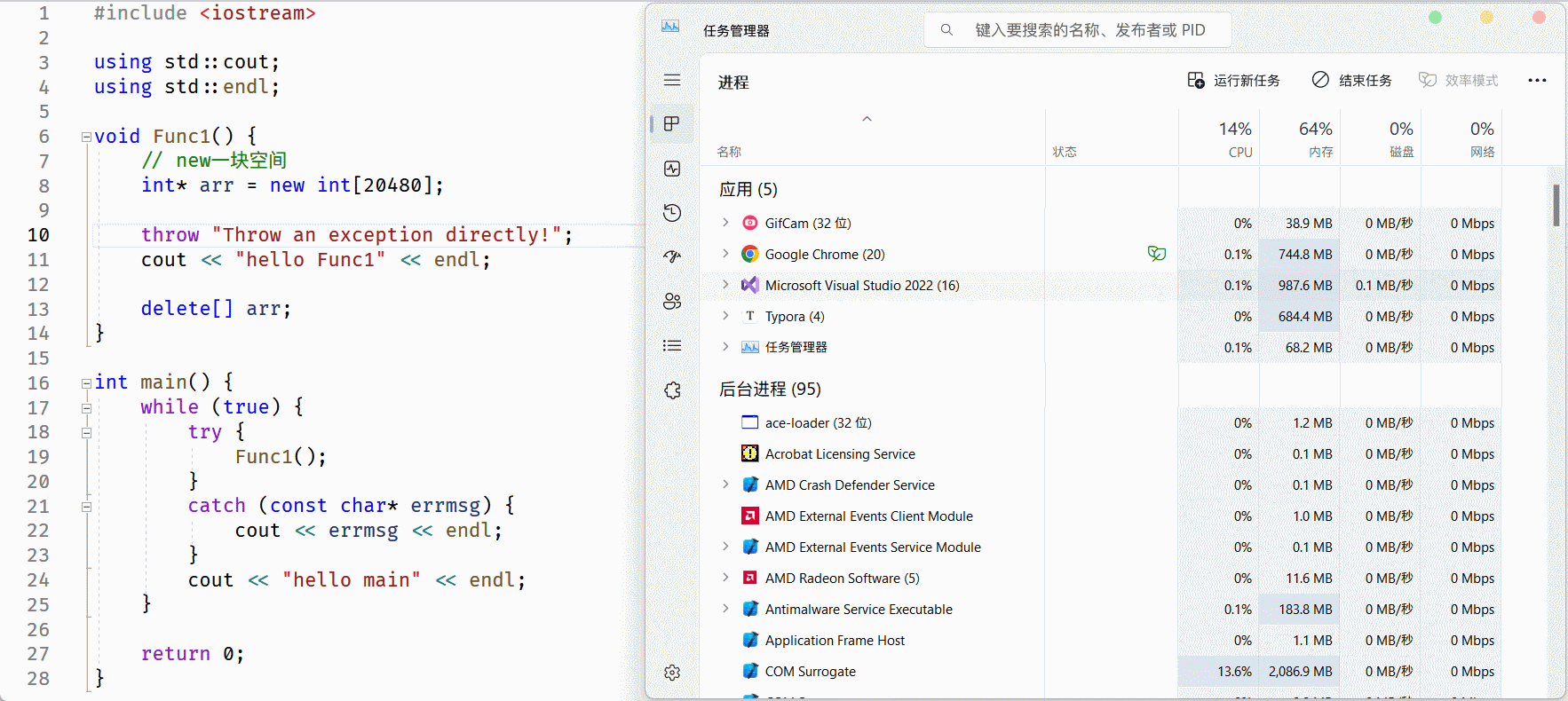 #include <iostream>using std::cin;using std::cout;using std::endl;class faClass {private:size_t _faExcID;};class sonClass: public faClass {private:size_t _sonExcID;};double division(int a, int b) {// 当b == 0时抛出异常if (b == 0) {throw "Division by zero condition!";}else if (b == 1) {throw faClass();}else if (b < 0) {throw sonClass();}elsereturn ((double)a / (double)b);}void func() {int len, time;cin >> len >> time;cout << division(len, time) << endl;}int main() {while (true) {try {func();}catch (const char* errmsg) {cout << errmsg << endl;}catch (const faClass& e) {cout << "main 捕获到faClass类异常 或 以faClass为基类的派生类异常" << endl;}}return 0;}这段代码: