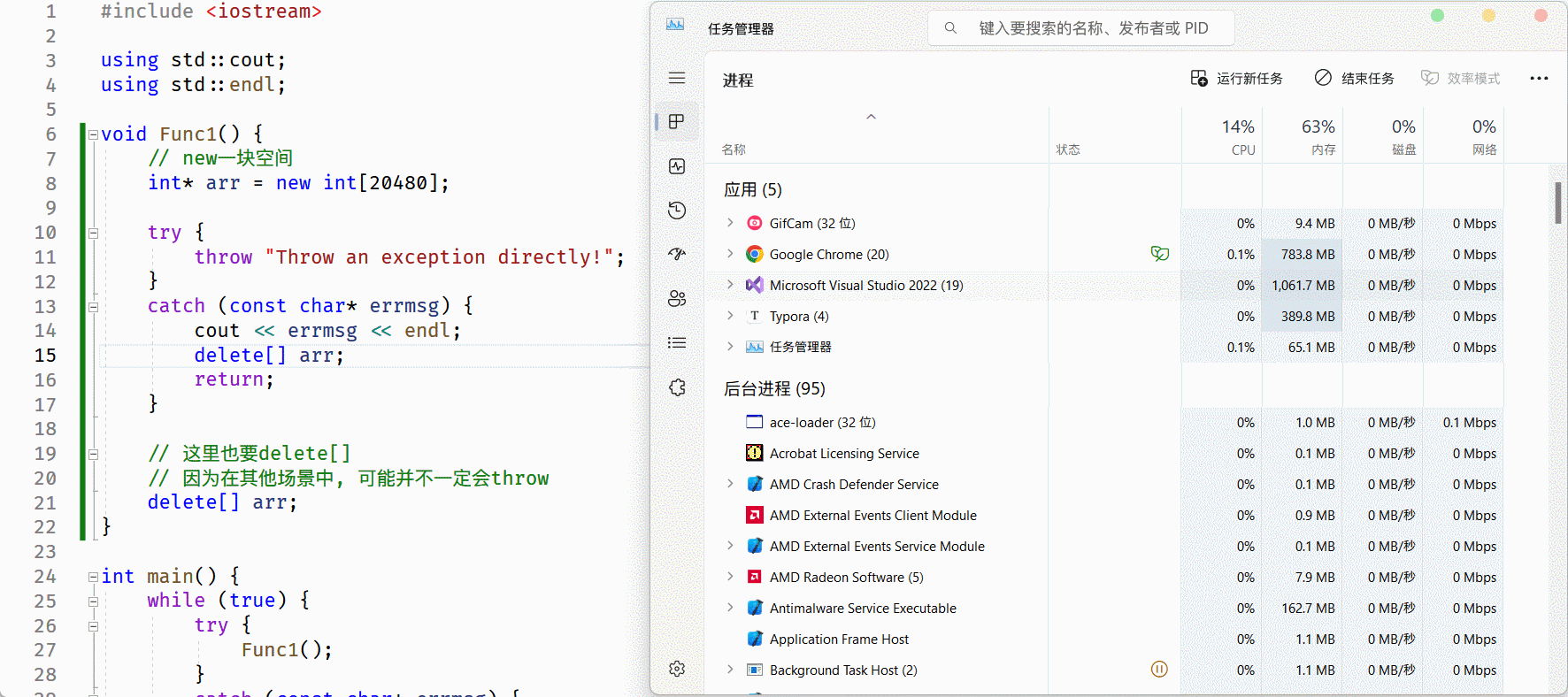 catch(const char* errmsg)之外, 只catch(const faClass& e)那么, 这段代码发生各种异常的结果是什么?