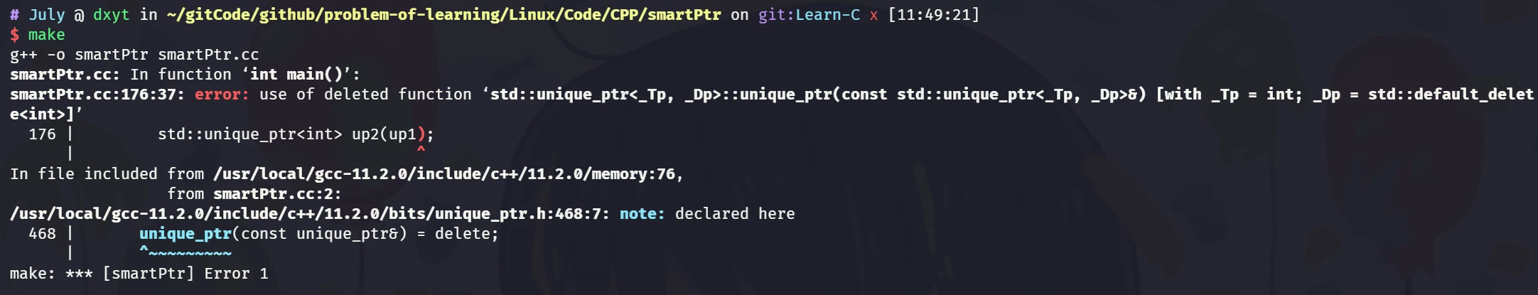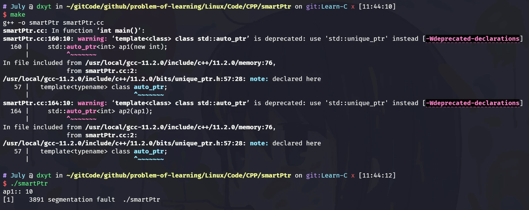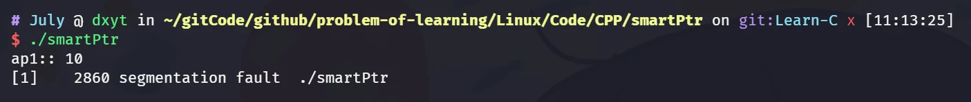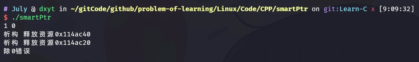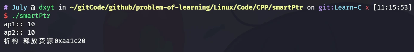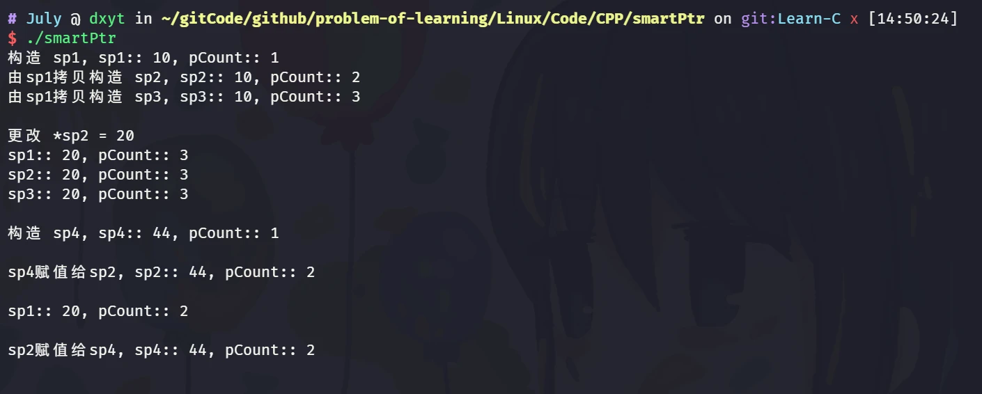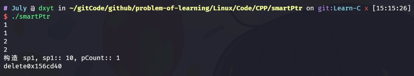 July::shared_ptr<int> sp1(new int(10)); cout << "构造 sp1, sp1:: " << *sp1 << ", pCount:: " << sp1.getCount() << endl;