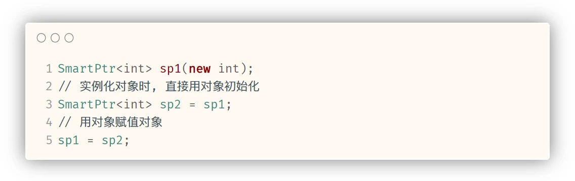 int main() { SmartPtr<int> sp1(new int); // 用 sp1 拷贝构造 sp2 SmartPtr<int> sp2 = sp1;