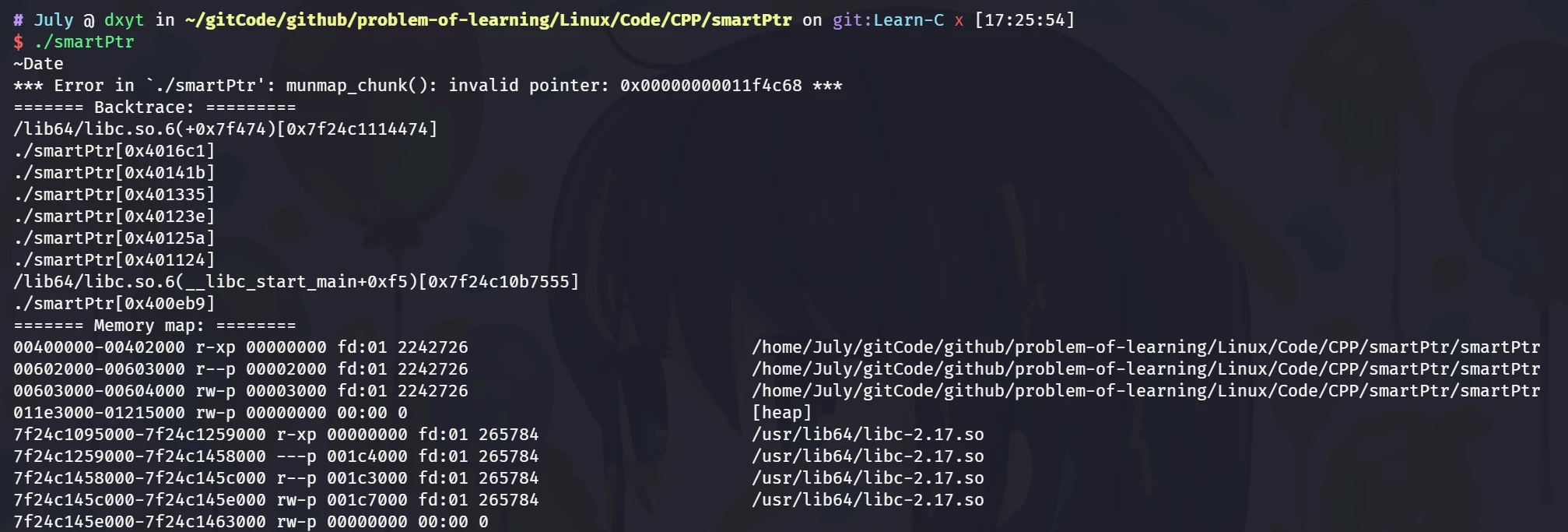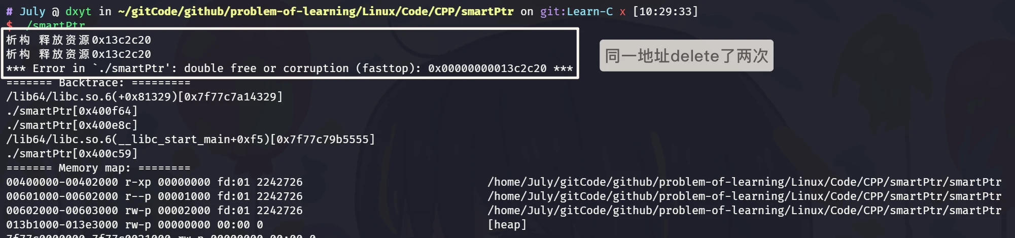 会发现, 同一块空间被释放了两次, 直接报错