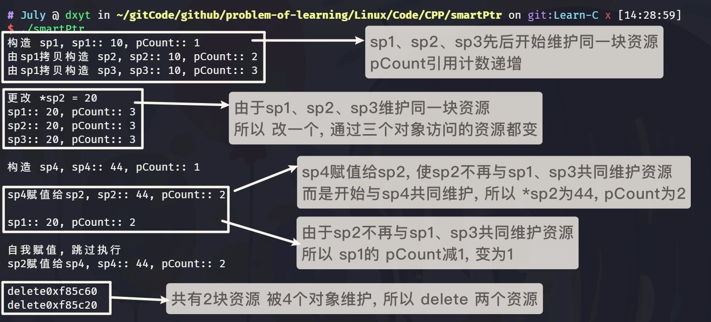 可以看到, main 函数执行完return 0;之后, sp1的引用计数从1->0, 资源被销毁