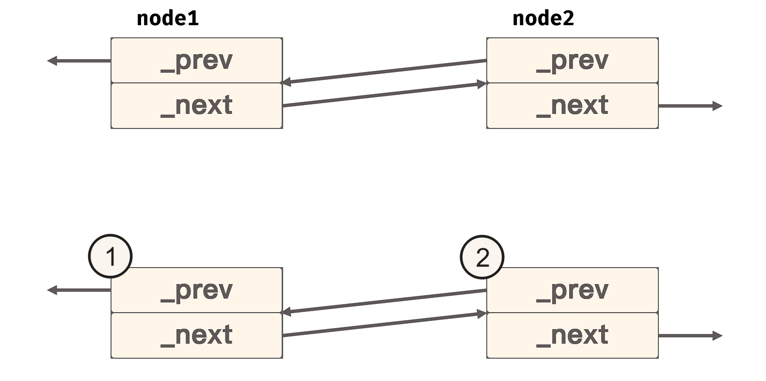 node1和node2对象被摧毁, 但由于原node2的_prev还在维护原node1的资源空间,原node1的_next还在维护原node2的资源空间, 导致两块资源空间没有释放变化如下: